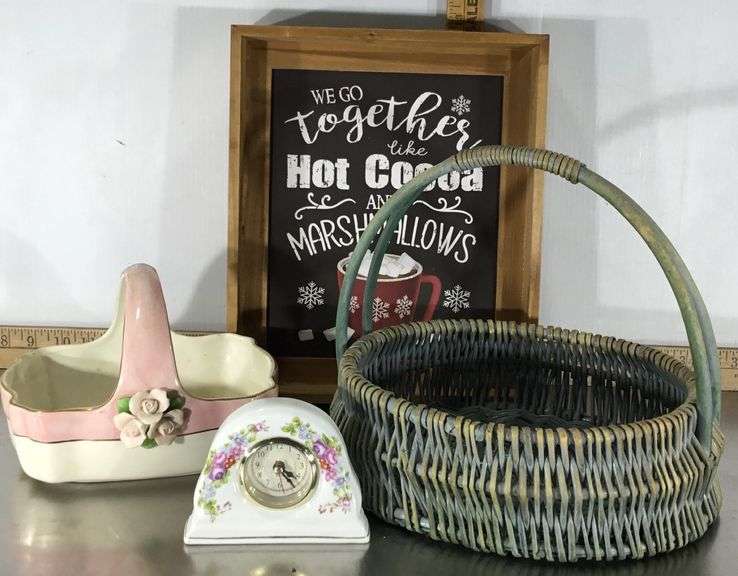 LOT 280 - Wicker Basket, Ceramic Basket, Floral Mantle Clock and Hot Cocoa Sign