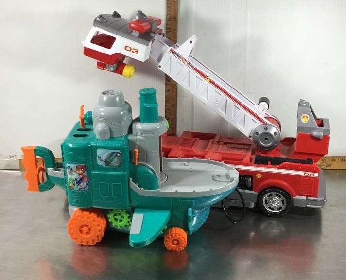 LOT 341 - Large Ladder Firetruck and PJMask Toys