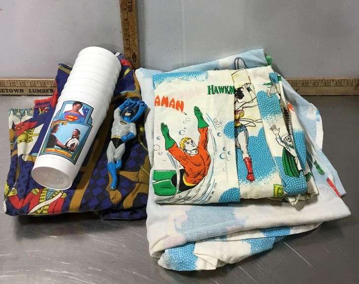 LOT 177 - Vintage Super Hero’s Curtain & Sheets, Superman Slurpee Cups, Avon Batman Brush & More
