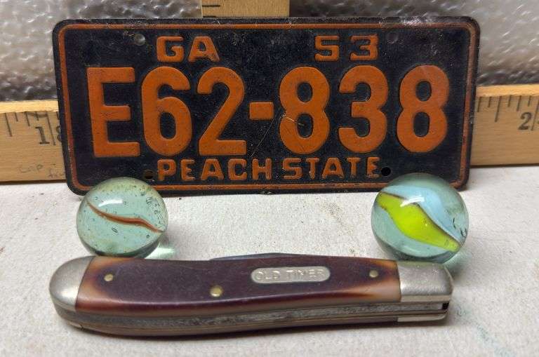LOT 229 - Peach State Mini License Plate, Marbles & Old Timer Pocket Knife