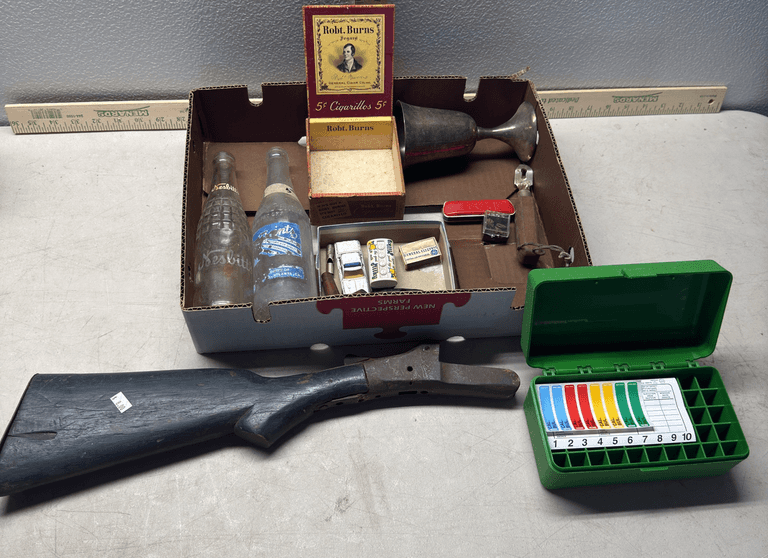 LOT 921 - Vintage Cigar Box, Glass Bottles, Shotgun Stock & More Collectibles