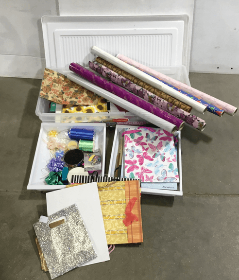 LOT 437a - Rubbermaid Tote of Gift Wraps, Gift Bags and More