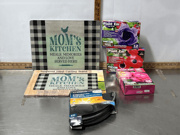 LOT 625 - Glass Mom’s Kitchen Cutting Boards, Plant Em’s, Steering Wheel Sunshade Cover