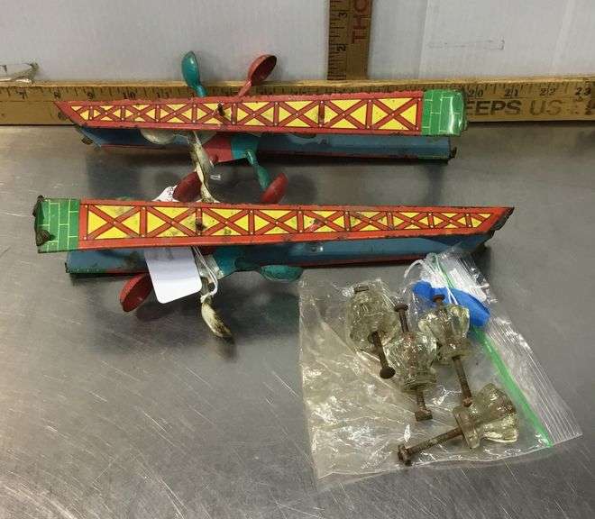 LOT 143 - Vintage Tin Toys and 2 Glass Door Knobs