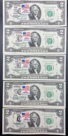 LOT 133 - 5 - Series 1976 $2 Federal Reserve Notes, Stamped, Consecutive Serial Numbers