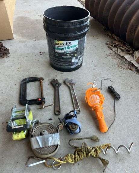 LOT 16 - 5 Gallon Bucket, Ratchet Straps, Wrenches