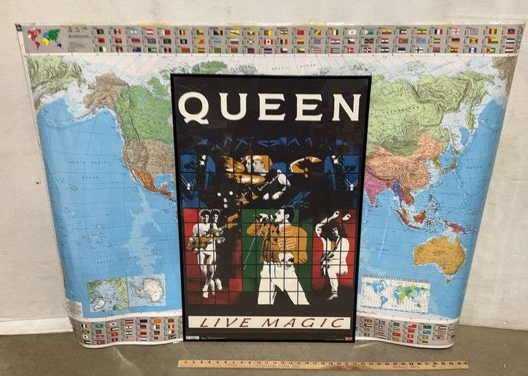 LOT 465 - Large Laminated World Map & Queen Concert Art