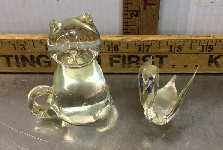 LOT 632 - Clear Glass Cat Paperweight and Blown Glass Swan