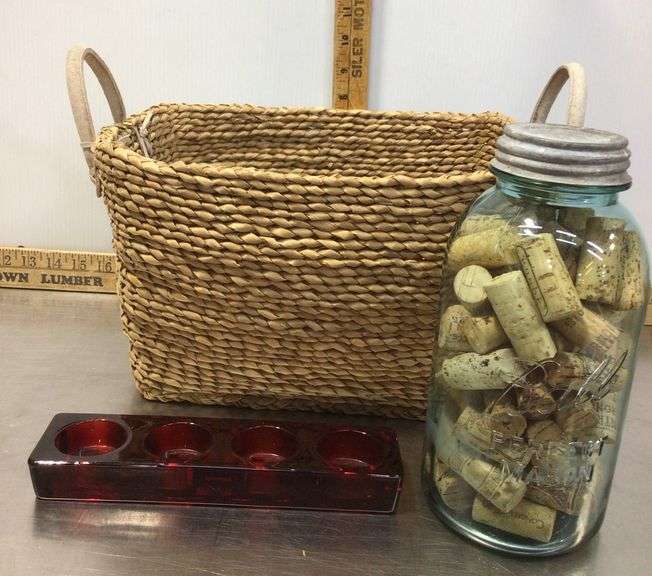 LOT 125 - Large Seagrass Basket With Handles, Blue Ball Half Gallon Jar With Wine Corks & Crate &Barrel Line T