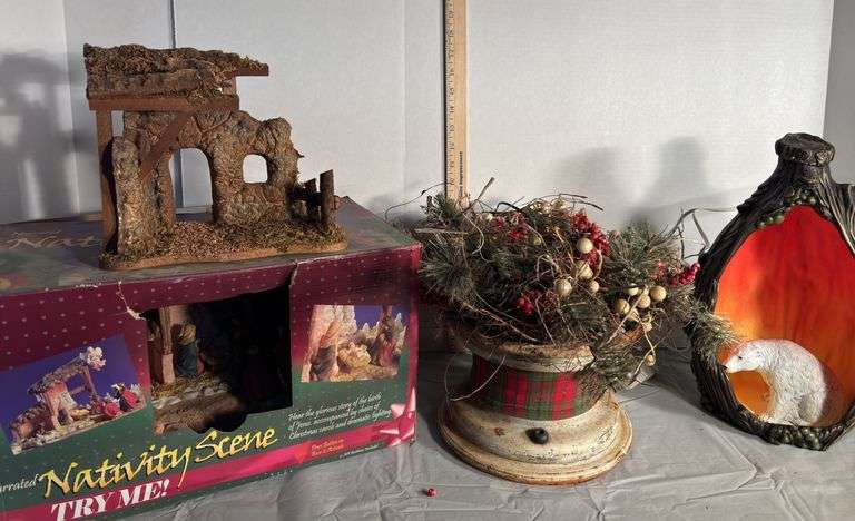 LOT 577 (3) - Nativity Scene & Extra Stable, Holiday Themed Arrangement in Rustic Wheel & Polar Bear