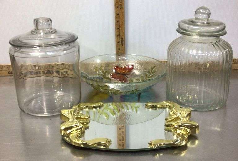 LOT 292 - Large Glass Lidded Jars, Gold Colored Bows Mirror Tray and Butterfly Glass Bowl
