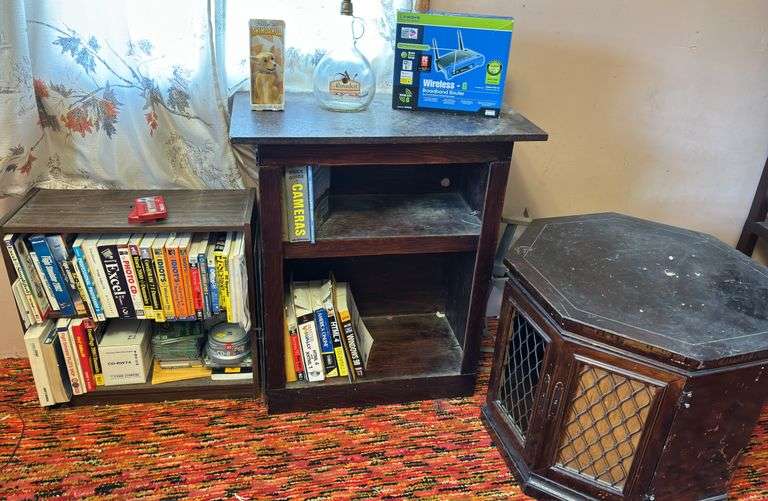 LOT 343 (3) - Bookshelves w/ Books, Mid-Century End Table & Wireless Broadband Router