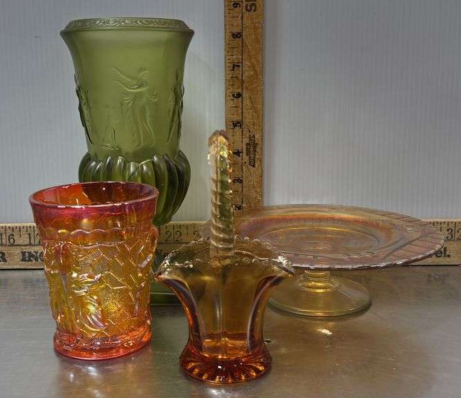 LOT 328 - Carnival Glass Serving Dish, Frosted Vase, Amber Scalloped Edge Basket & Glass Tumbler