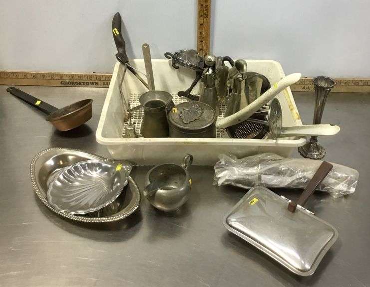 LOT 608 - Plastic Crate of Pewter Dishes and Decor