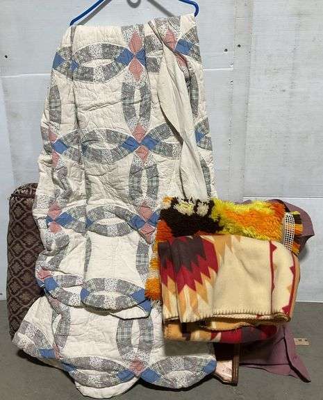 LOT 451 - Pillows, Throw Blanket, Quilt, Wooden Shelf & Rug Yarn