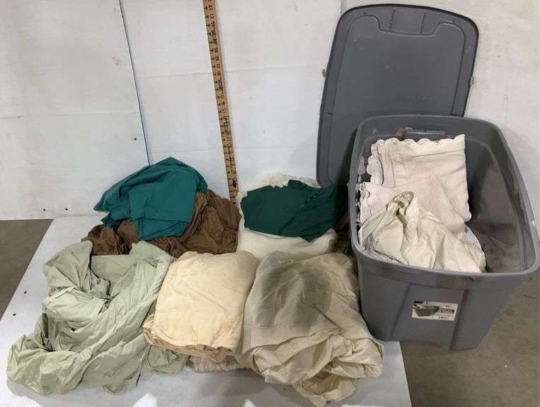 LOT 430 - 20 Gal. Lidded Tote with Sheets, Curtains & More