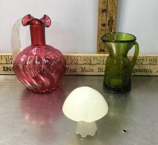 LOT 348 - Stone Mushroom and Colored Glass Mini Vases