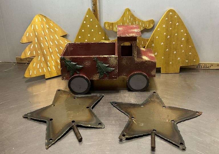 LOT 96 - Wooden Christmas Truck & Trees & Heavy Christmas Metal Stars