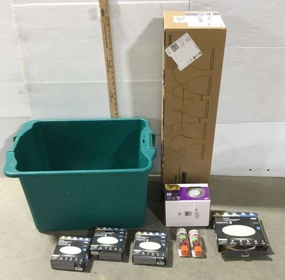 LOT 425 - Vanity Bar Light, LED Round Flat Panel Lights, Tote, LED Recessed Kit and 2 Roundovers