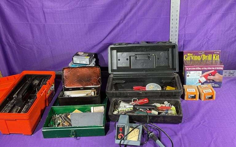 LOT 475 - Soldering Iron, Mini Carving Kit, Assorted Fasteners & Toolboxes