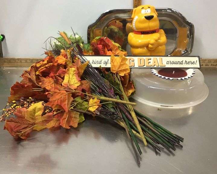LOT 299 - Faux Fall Flowers, Microwave Cover, Tray & Plastic Cookie Jar