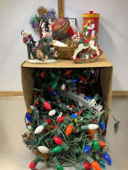 LOT 382 - Large Box of Lights (untested), Christmas Decor, Duck Basket, Ceramic Wooden Shoe & Misc
