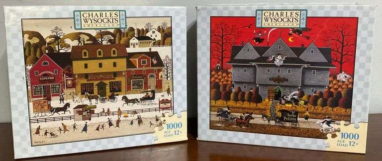 LOT 621 - (2) Charles Wysocki Puzzles Witche’s Brew Halloween & Lilac Square Winter (no missing pieces)