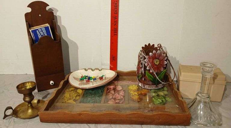 LOT 121 - Glasstop Serving Tray, Wooden Match Stick Holder, Candle Stick Holders and More