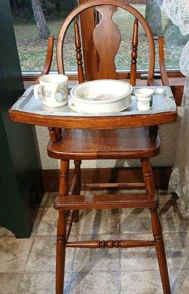 LOT 126 - Wooden Highchair + Dishes, Seat is 24" Overall Height is 41"