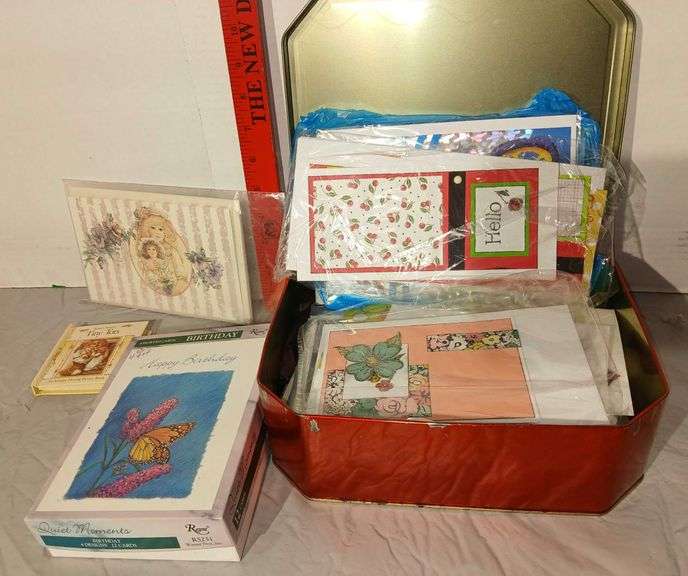 LOT 134 - Metal Tin with Hinged Top + Greeting Cards