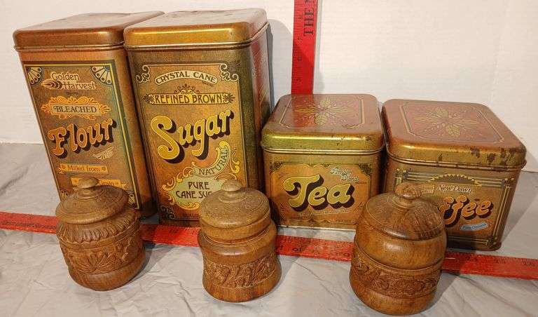 LOT 138 - Four Piece Tin Container Set and Three Hand Carved Wooden Trinket Holders