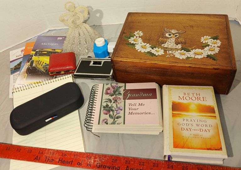 LOT 221 - Desk Clean Out, Wooden Box 10×8×3 Travel Clock, Binoculars and More