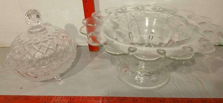LOT 230 - Heisey Glass Serving Bowl with a Scalloped Edge + Crystal Candy Dish w/ a Lid