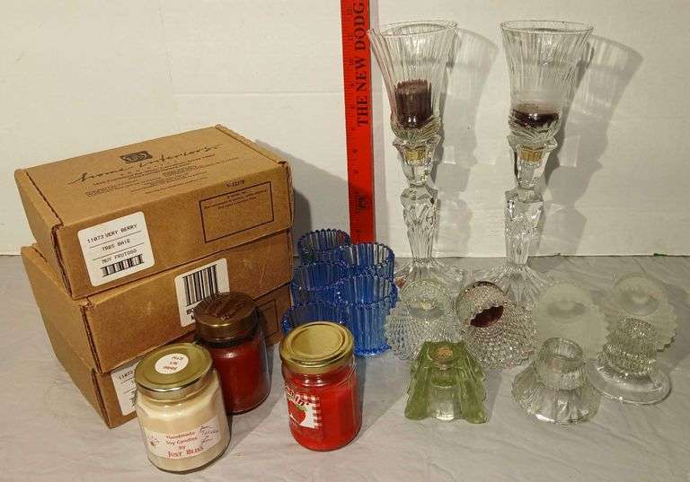 LOT 234 - Two 7" Crystal Candle Holders, Nine Votive Candle Holders, Candles and More