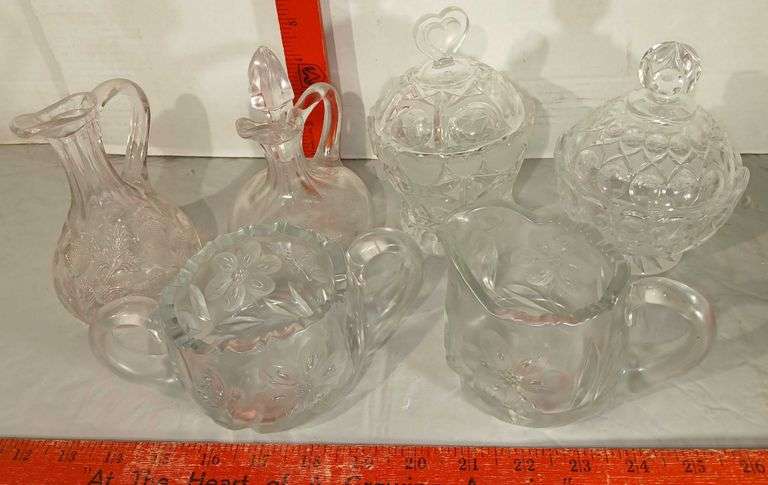 LOT 239 - McKee Cut Glass Cream & Sugar, Cruets and Covered Bowls