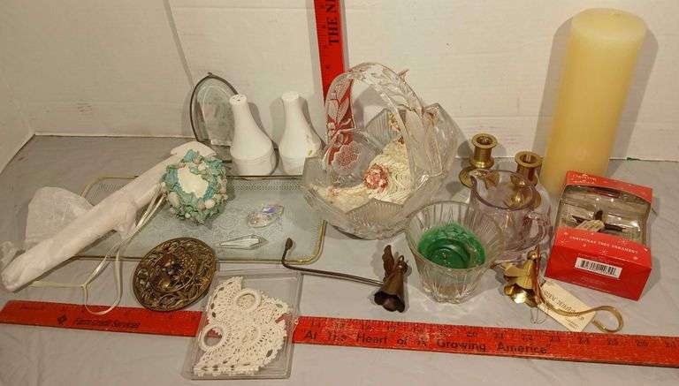 LOT 247 - Floral Crystal Basket with a Handle, Salt and Pepper Shakers, Creamer and More