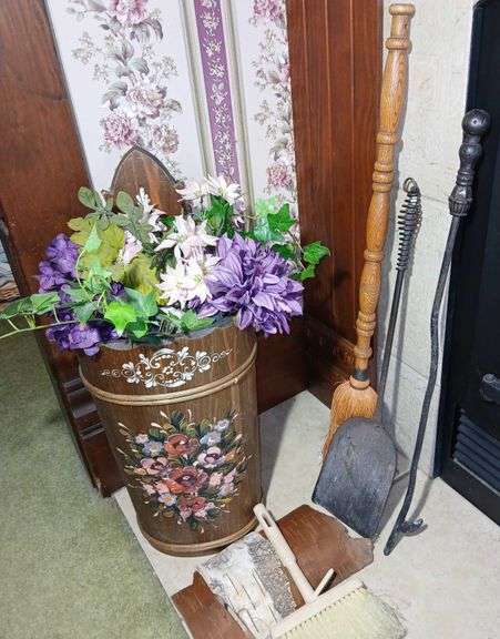 LOT 250 - Fireplace Shovel and Poker, 24"T Wooden Decorative Piece with Artificial Flowers and More