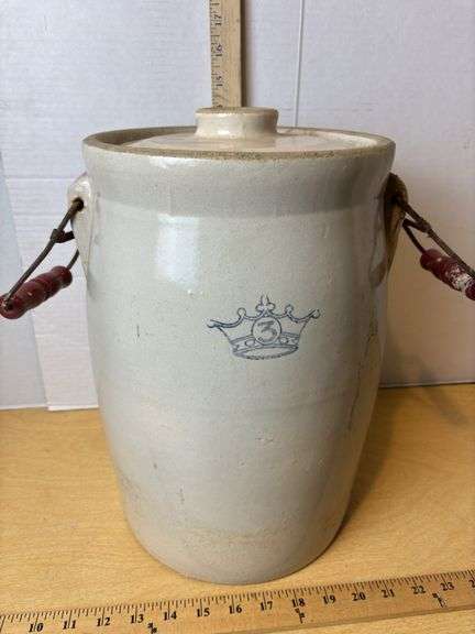 LOT 595 - Blue Crown Salt Glazed 3 Gallon Stoneware Crock w/ Red Handles & Lid