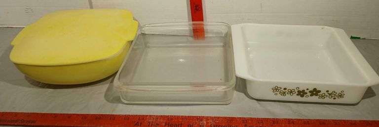 LOT 256 - Pyrex Yellow 525B-025 with Lid, Spring Blossom 922 and Clear Pyrex