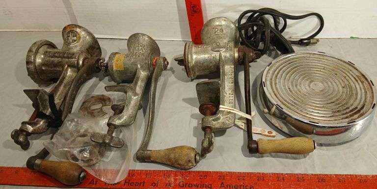 LOT 262 - Griswold, Keystone and Climax Food Grinders & Hot Plate (has power)