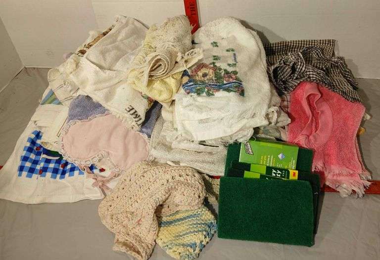LOT 267 - Kitchen Towels, Scrub Pads, Bibs, Dish Clothes and an Apron