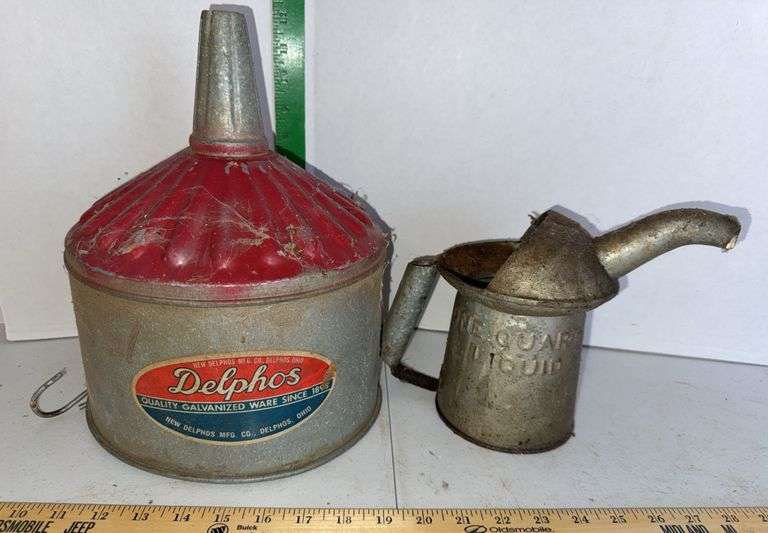 LOT 128 - Delphos Galvanized Steel Funnel & One Quart Galvanized Oil Can