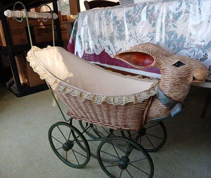 LOT 326 - Victorian Era Wicker Doll Stroller with Metal Wheels 29"T × 32"L×13"W