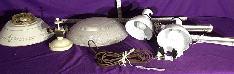 LOT 546 - (2) Glass Ceiling Light Shade, Extension Cord and (2) Clamp on Lights