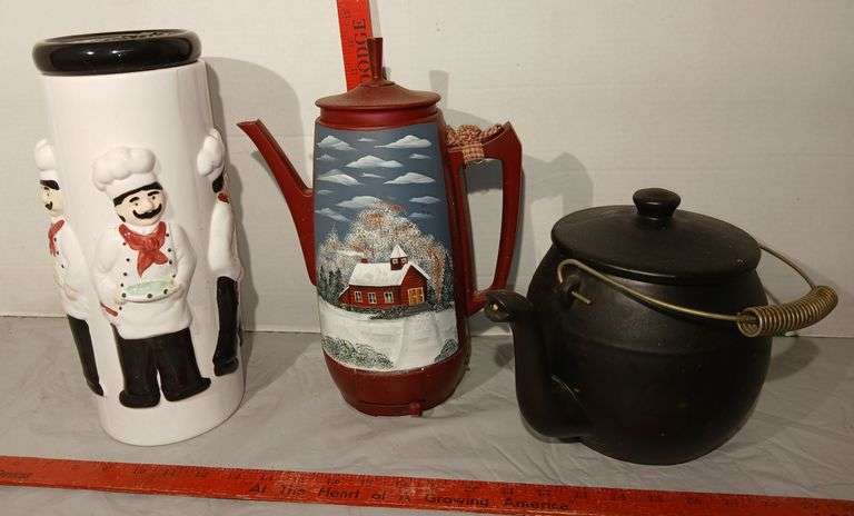 LOT 284 - Ceramic Teapot, Painted Coffee Pot and Pasta Storage