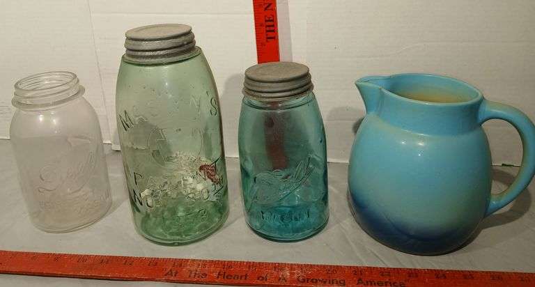LOT 288 - Green Mason Jar 2qt, Blue Ball Jar, Roseville Art Pottery Pitcher