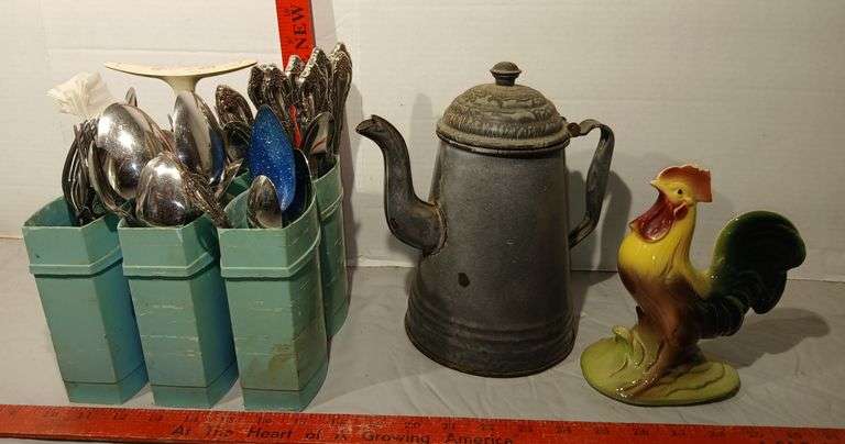 LOT 290 - Silverware Caddy with Silverware, Granite Ware Coffee Pot and Ceramic Rooster