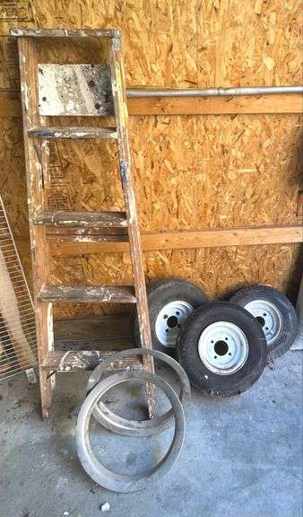 LOT 57 (2) - 5’ tall Step Ladder, 3 Tires & Rims-see pics + 2- 16” Beauty Rings