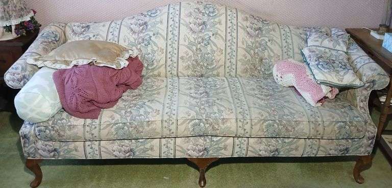 LOT 8 - Vintage Sofa with Floral Design, 7' Long with Pillows and Afagans