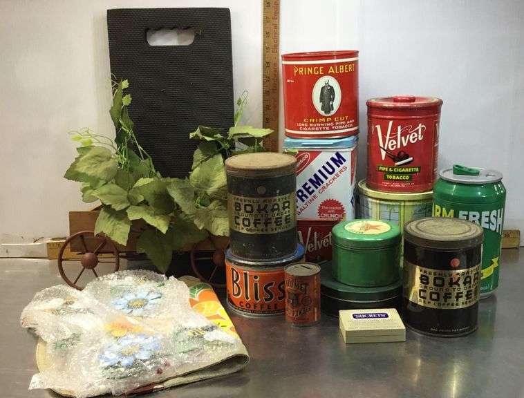 LOT 162 - Vintage Tins, Garden Decor, Wooden Wagon Decor, Farm Fresh Mug and Soft Pad